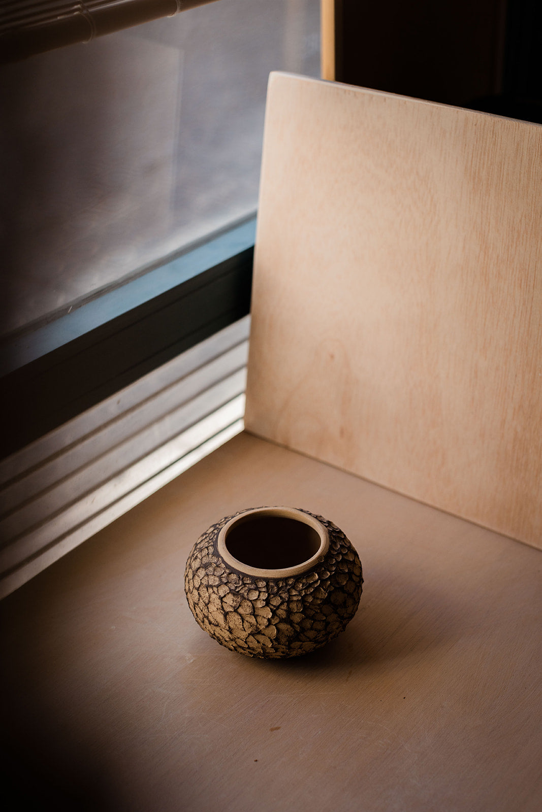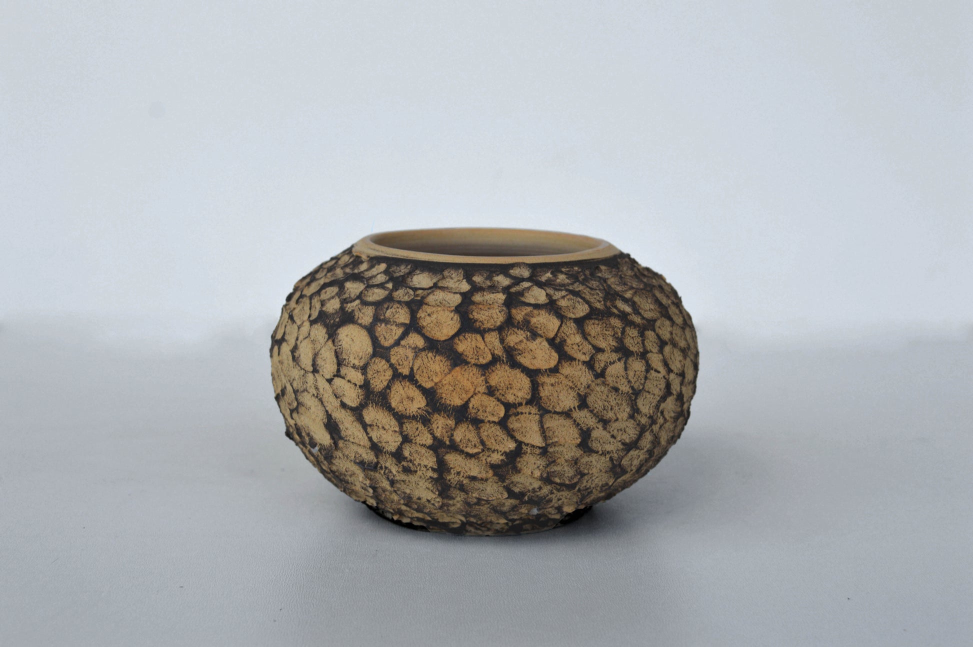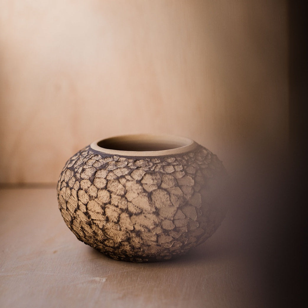 Les boles amb textura també són una col·lecció diversa. Estan fetes al torn, amb tècniques diferents, però totes parteixen de l'expansió. És a dir, començo amb un cilindre, aplico una textura, i després obro la peça només tocant l'interior. La textura s'amolla a la forma i genera efectes. La gamma de colors sempre és terròs, utilitzo directament l'acabat dels fangs en cru, sense esmalt. Poden ser de decoració, com per posar plantes, ja que al no estar esmaltades són poroses.