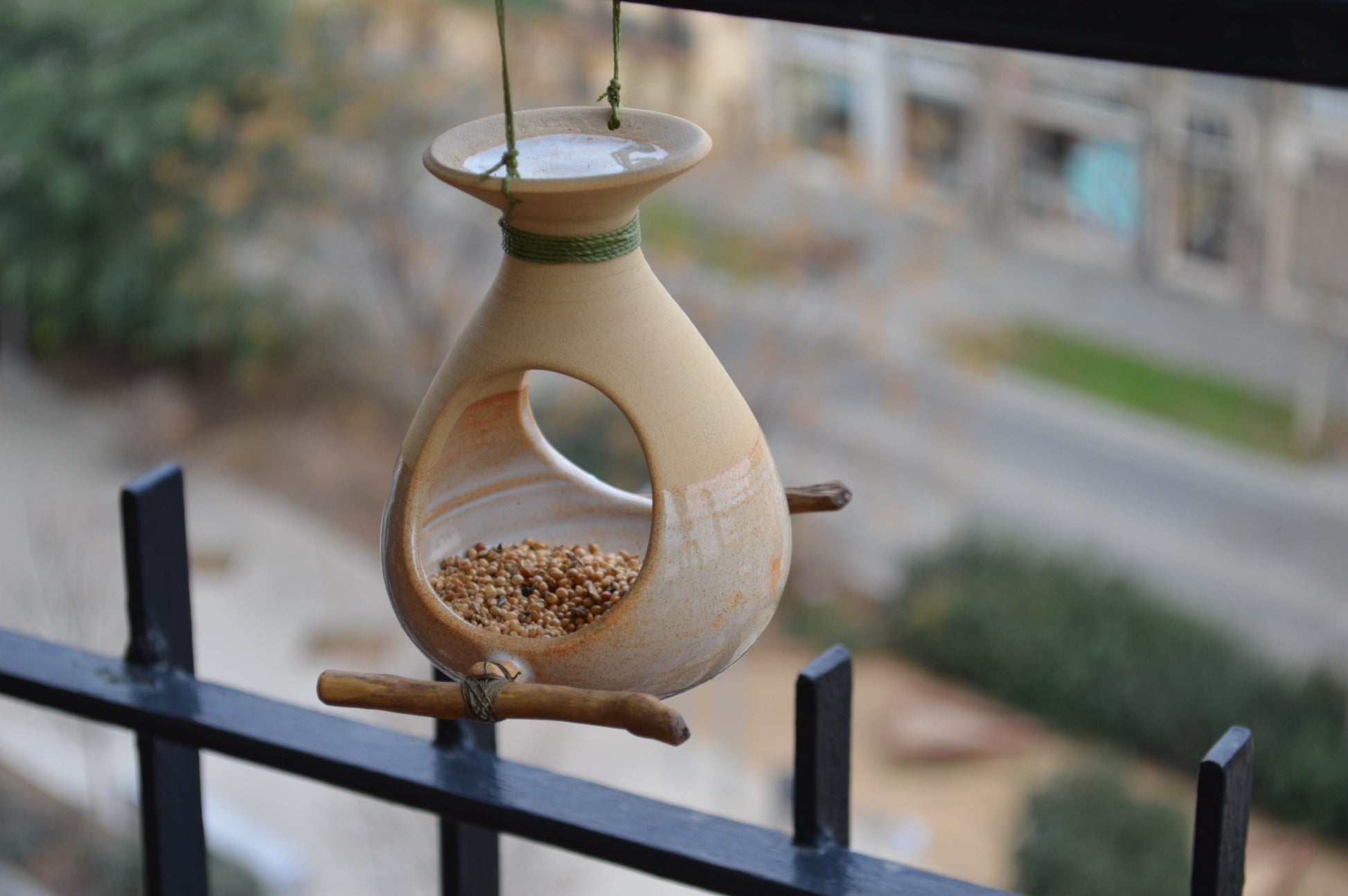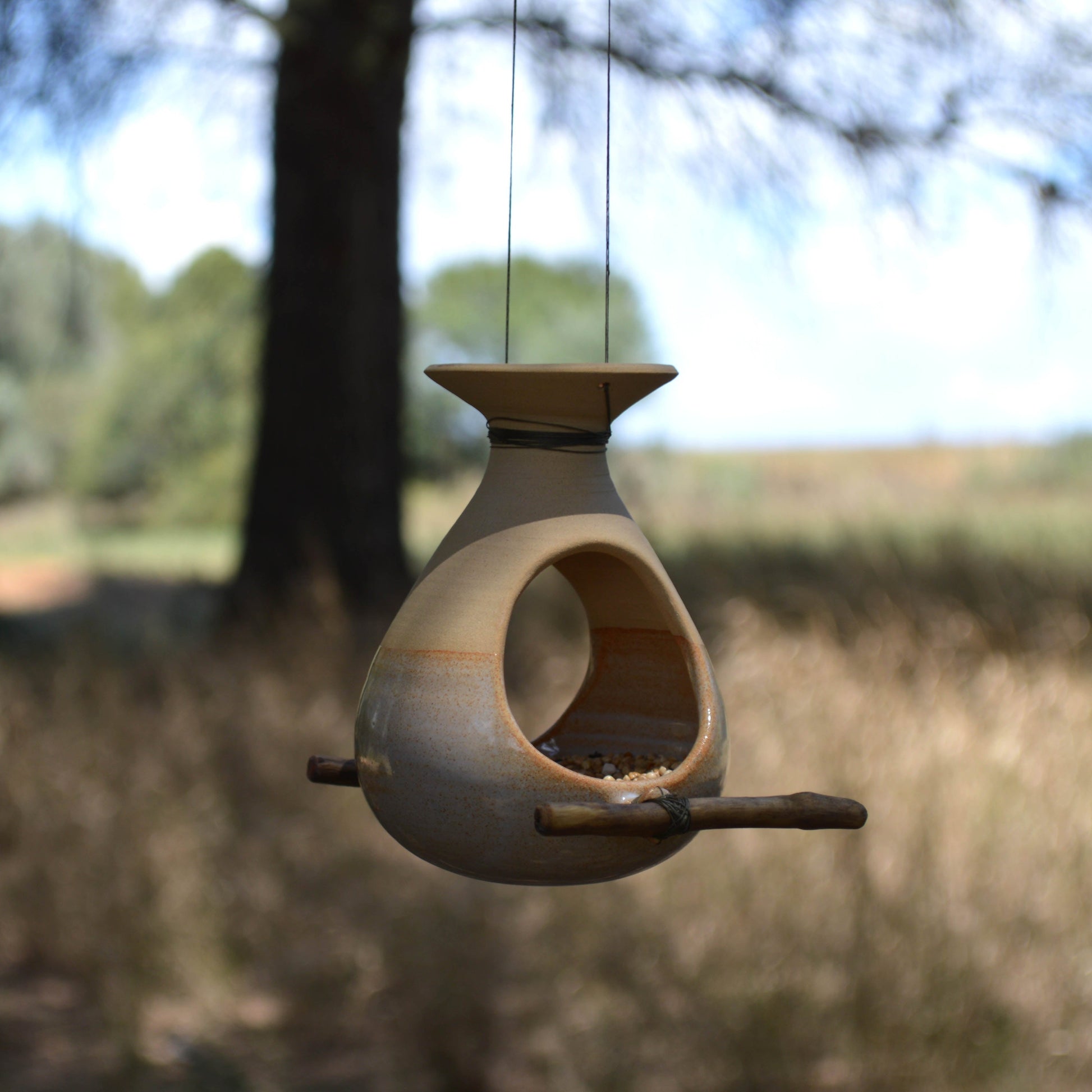 Les menjadores per ocells estan fetes de gres d'alta temperatura. La part on es diposita el menjar en gra, està esmaltada per tal de mantenir-ho més higiènic, la resta té el color propi del fang al natural. Venen amb dues cordes de fil encerat, ja preparades per ser fàcilment penjades d'alguna branca o barana de balcó. La corda és resistent a l'aigua, igual que la fusta que també està tractada amb un oli especial per impermeabilitzar-la.