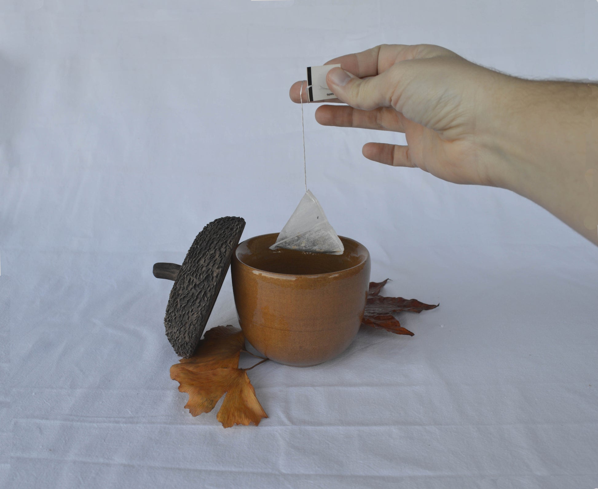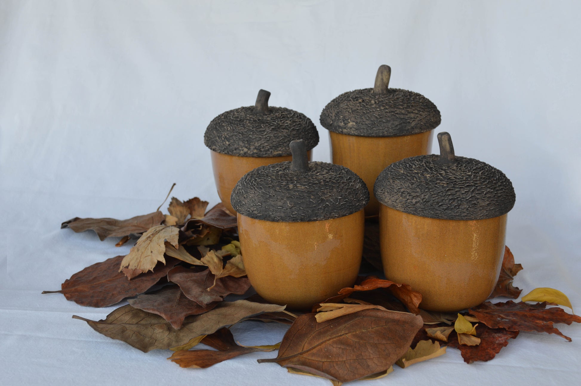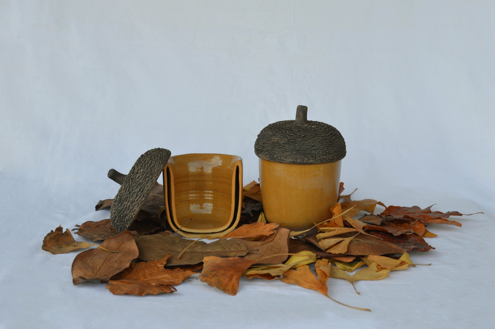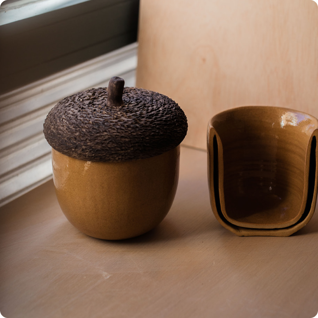 Les tasses aglà serveixen per infusionar i beure té. Estan fetes al torn, en tres peces separades i són probablement la peça més complexa que tinc en col·lecció. Són de gres, i com es pot veure a la primera imatge tenen doble paret. Aquest disseny està pensat per tal que no et cremis la mà en posar-hi l'aigua calenta i agafar-la. Es pot posar al microones i al rentaplats. No tenen una mida fixa, ja que m'agrada que siguin diferents com els aglans de debò.