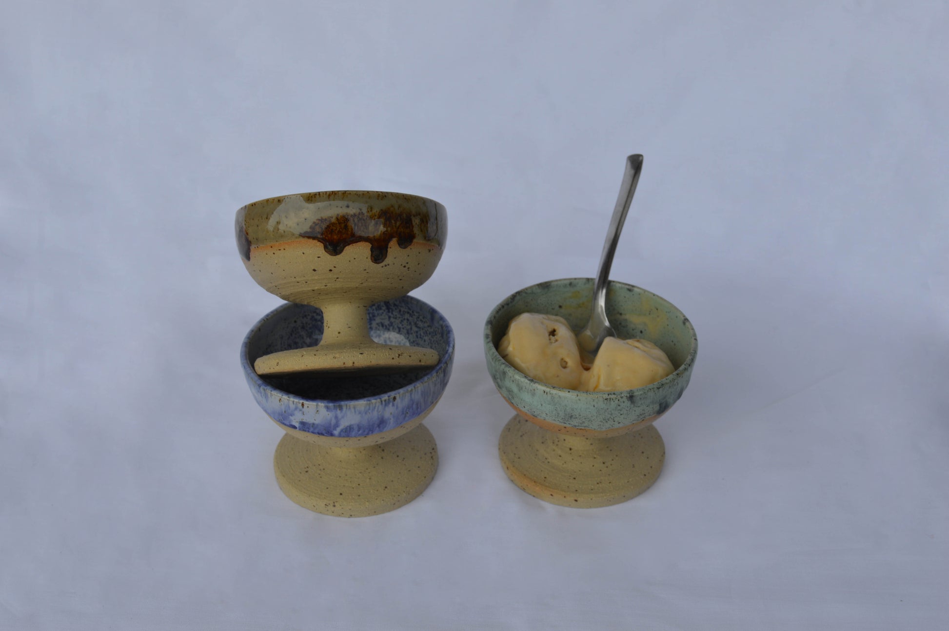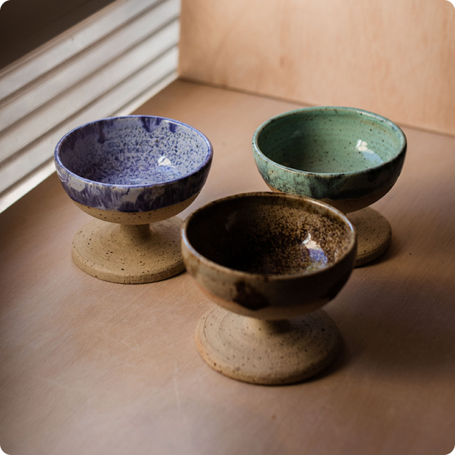 Les copes de gelat estan fetes al torn amb gres xamotat i motejat d'alta temperatura. Aquest material ens ofereix màxima qualitat i resistència tant als cops com al xoc tèrmic. Estan pensades tant per gelat, com per qualsevol mena de postres o beguda.